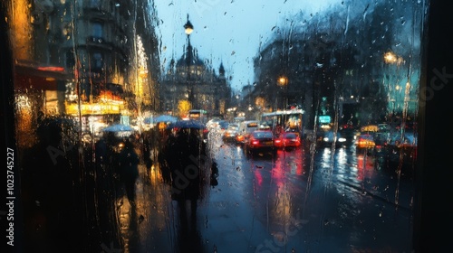 Fototapeta premium A rain-soaked city seen through a caf window, with blurred lights of passing...