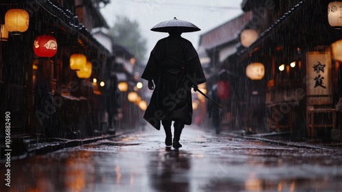 © Sasint, Obraz premium A rain-soaked street in an ancient Japanese village, the scene dimly lit by lanterns, with a lone samurai walking through, his black cloak flowing as rain splashes underfoot