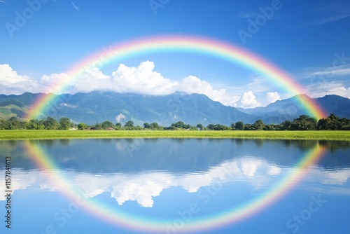 Naklejka premium A rainbow appears above a stormy sky in a rural area during the summer