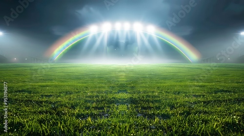 Naklejka premium A rainbow appears over a grassy field illuminated by stadium lights, creating...