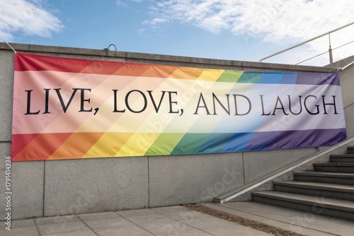 © Photo, Obraz premium A rainbow banner with the words Live Love and Laugh