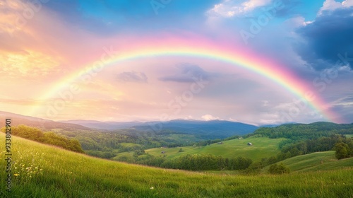 Naklejka premium A rainbow stretching across a peaceful countryside, with green grass and...
