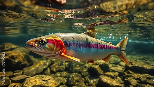Naklejka premium A rainbow trout glides through a clear mountain stream, sunlight shimmering...