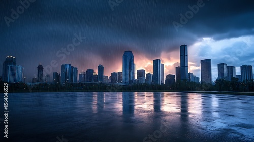 Fototapeta premium A rainstorm falling over open land, casting a dramatic and moody scene across...