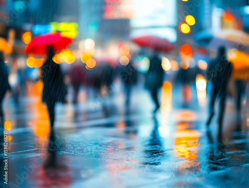 © Aisyaqilumar, Fototapeta premium A rainy city square is viewed through a blurred, water-streaked window, showing abstract shapes of people and glowing neon lights in blue, orange, and yellow.