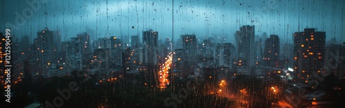 Fototapeta premium A rainy cityscape at dusk seen through a window, evoking cinematic melancholy. Great for urban storytelling, emotional visuals, and drama-themed projects.