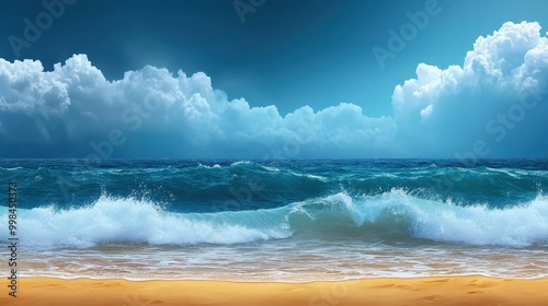 © songwut, Fototapeta premium A rainy day at the beach, waves crashing under dark clouds