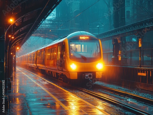 © EDIE, Naklejka premium A rainy evening at a city train station with glowing lights and a passing train