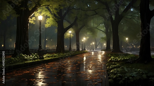 Obraz premium A Rainy Night in the Park: Serene Atmosphere Amidst Drizzling Rain