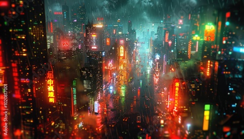 © boler, Obraz premium A Rainy Night View of a Cityscape with Neon Lights