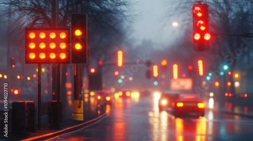 Fototapeta premium A rainy street scene with illuminated red traffic lights and blurred car...