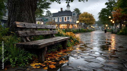© hamza, Obraz premium A rainy street scene with puddles reflecting warm lights and empty benches.
