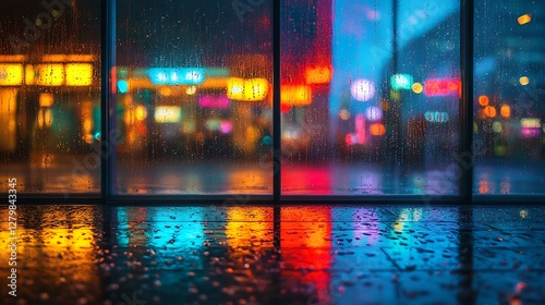 Naklejka premium A rainy urban nightscape with shimmering reflections on the street, viewed from the warm interior of a modern office, raindrops streaming down the glass, neon lights casting colorful glows,
