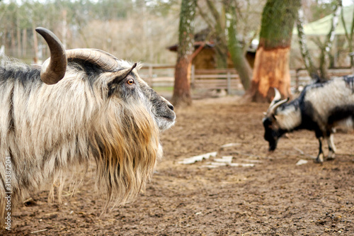 Fototapeta premium A ram with swirling horns. Farming, animal breeding concept.