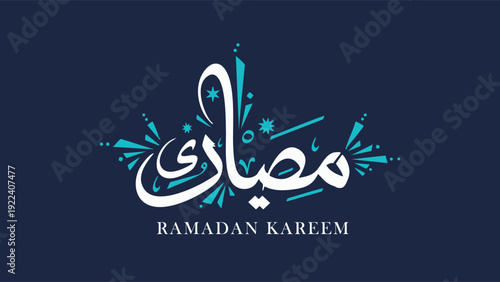 © MdAbdul, Obraz premium A Ramadan Kareem greeting card with Arabic calligraphy and decorative design elements on a dark blue background.