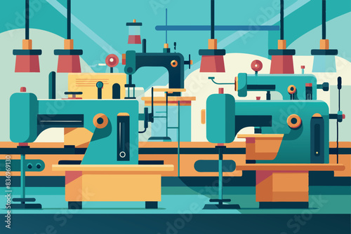 Fototapeta premium a range of sewing machines, could be a textile factory or a tailoring workshop. Each machine is equipped with spools of thread, adjustment knobs and needles.