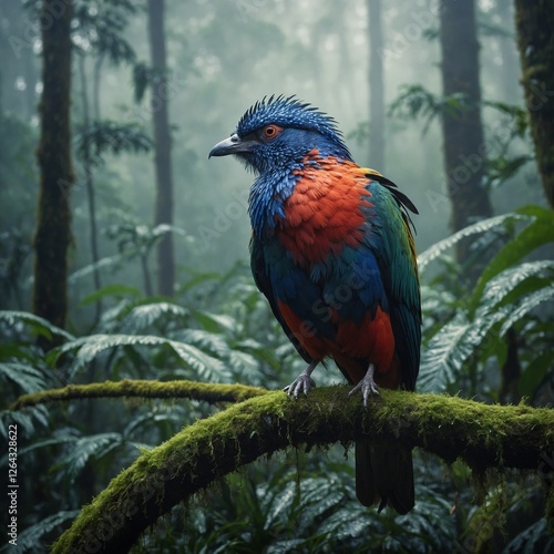 © Muhammad, Obraz premium A rare, exotic bird with dazzling plumage in a misty rainforest.