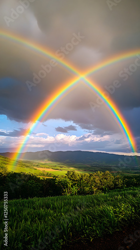 Naklejka premium A Rare Quadruple Rainbow Arcs Across a Serene Landscape, Capturing Nature's Majestic Light Spectrum in a Breathtaking Display
