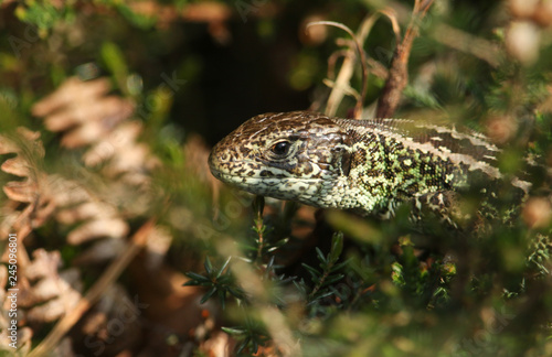 Naklejka premium A rare Sand Lizard (Lacerta agilis) hunting in the undergrowth.