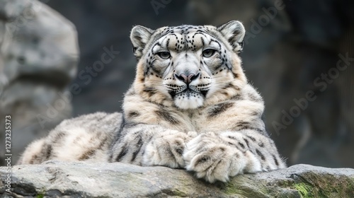 © Samady, Fototapeta premium A rare snow leopard resting on a rocky mountain ledge