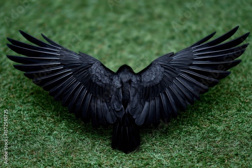 © Andrea, Naklejka premium A raven lying on green grass with spread wings