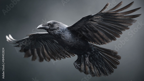 © Thiago, Obraz premium A raven soaring majestically through the sky, showcasing its impressive wingspan