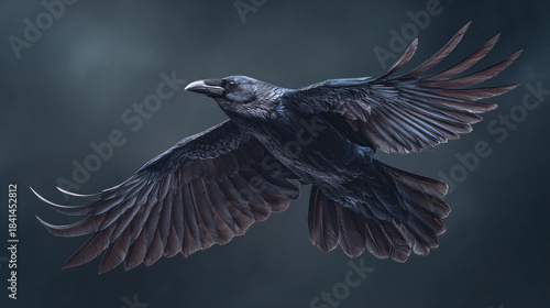 © Thiago, Obraz premium A raven soars gracefully through the air, wings spread wide against a dark sky. The bird's sleek, dark feathers are visible as it flies