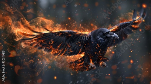 Naklejka premium A raven with fiery wings soars through a dark forest in a magical twilight...