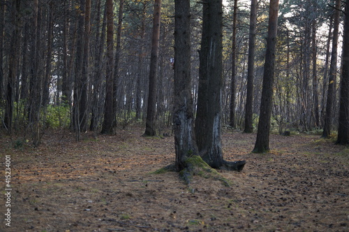 © Egor, Fototapeta premium a ray of light in a meadow between coniferous trees in the park