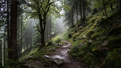 Obraz premium A realism scene featuring a quiet forest trail with morning mist