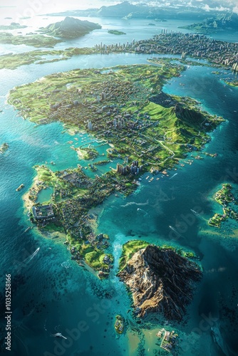 Fototapeta premium A realistic aerial view of the immense island, with cities in sight on either...