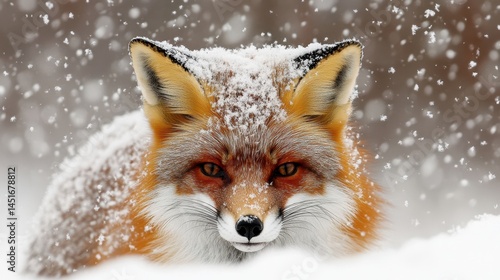 Obraz premium A realistic animal photograph captures a red fox in a snowfall, highlighting...