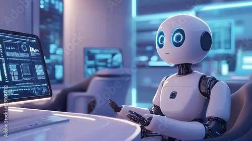 © Naruephu, Fototapeta premium A realistic animation of an advanced business environment where robotic automation and AI-driven analytics streamline operations, with executives analyzing real-time data on floating digital