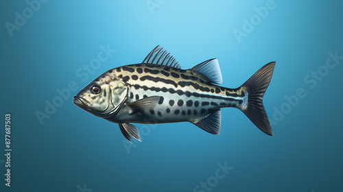 Fototapeta premium A realistic, black and white spotted fish against a blue background, perfect for marine life, aquatic, and ocean themes.