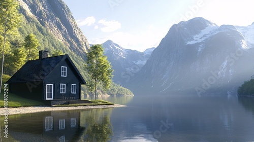 Fototapeta premium A realistic black house on the shore of a calm lake with towering mountains...