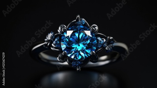 © boy 3344, Fototapeta premium A realistic blue diamond with vivid brilliance and depth, surrounded by a soft glowing light ring on a polished black background