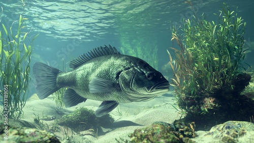 Fototapeta premium A realistic close-up of a sea bass resting on the ocean floor, photorealistic...