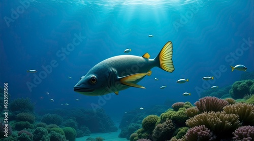 © Spirit, Fototapeta premium A realistic cuttlefish gracefully swimming over a vibrant coral reef crystal-clear blue ocean water