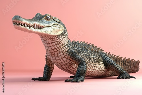 © Bang AI, Fototapeta premium A realistic 3D rendering of a crocodile against a pink background.