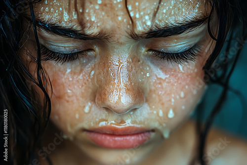 © River Girl, Fototapeta premium A realistic depiction of a child crying, showing tears streaming down their face, expressive emotions, and a vulnerable moment, emphasizing innocence and raw emotion.