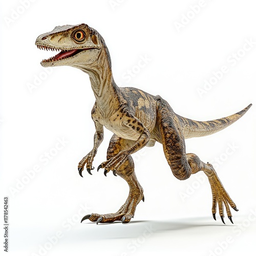 © Shapiere_Colections, Obraz premium A realistic depiction of a dinosaur, specifically a velociraptor, in a dynamic pose.