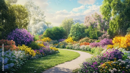 Fototapeta premium A realistic depiction of a garden in full bloom with colorful flowers, neatly trimmed bushes, and a path winding through well-tended plants and trees