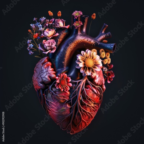 Fototapeta premium A realistic depiction of a human heart adorned with flowers, set against a...