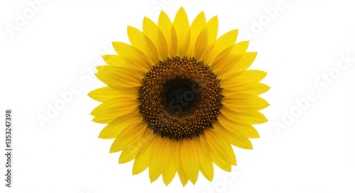 Fototapeta premium A realistic, detailed depiction of a single, vibrant sunflower with bright yellow petals and a dark center, set against a pure white background