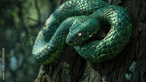 Fototapeta premium A realistic green snake coiled around a tree, nature background