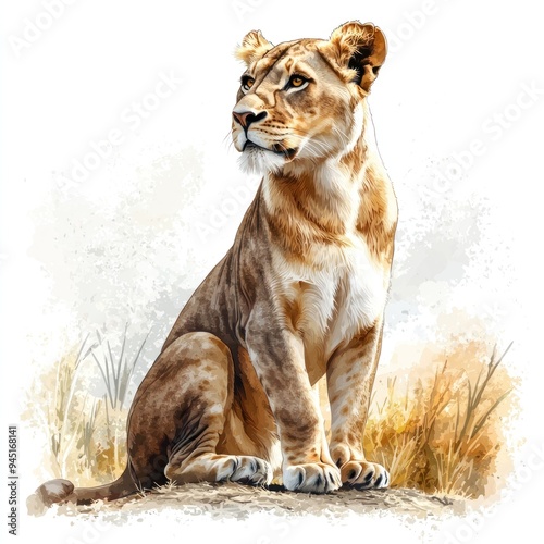© Thanyaporn, Fototapeta premium A realistic high-resolution photo of a majestic lioness watching over her territory, rendered in watercolor clipart style. The lioness's strong frame and alert posture are depicted with bold