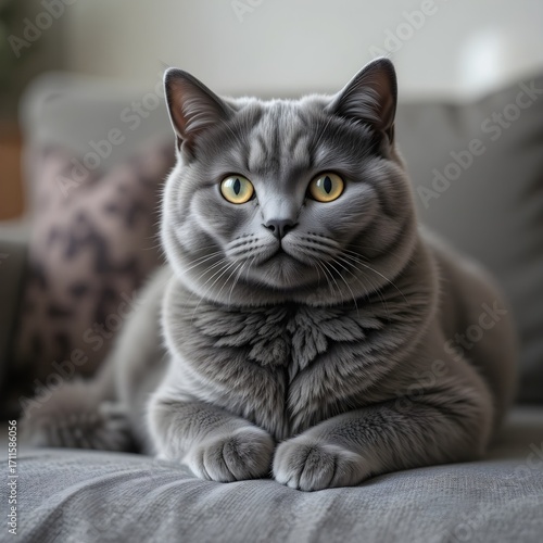 © Saqlain, Obraz premium A realistic photo of a British Shorthair cat, round face, dense grey fur, sitting calmly on a sofa, ultra realistic