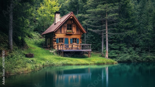 Fototapeta premium A realistic photo of a cozy wooden cabin deep in the woods with a small pond...