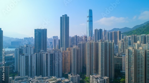 Naklejka premium A realistic photo of multiple modern skyscrapers in a dense urban area, their...