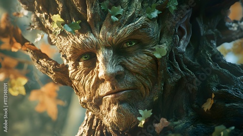 Obraz premium A realistic view of a woodland spirit peering curiously through a canopy of...